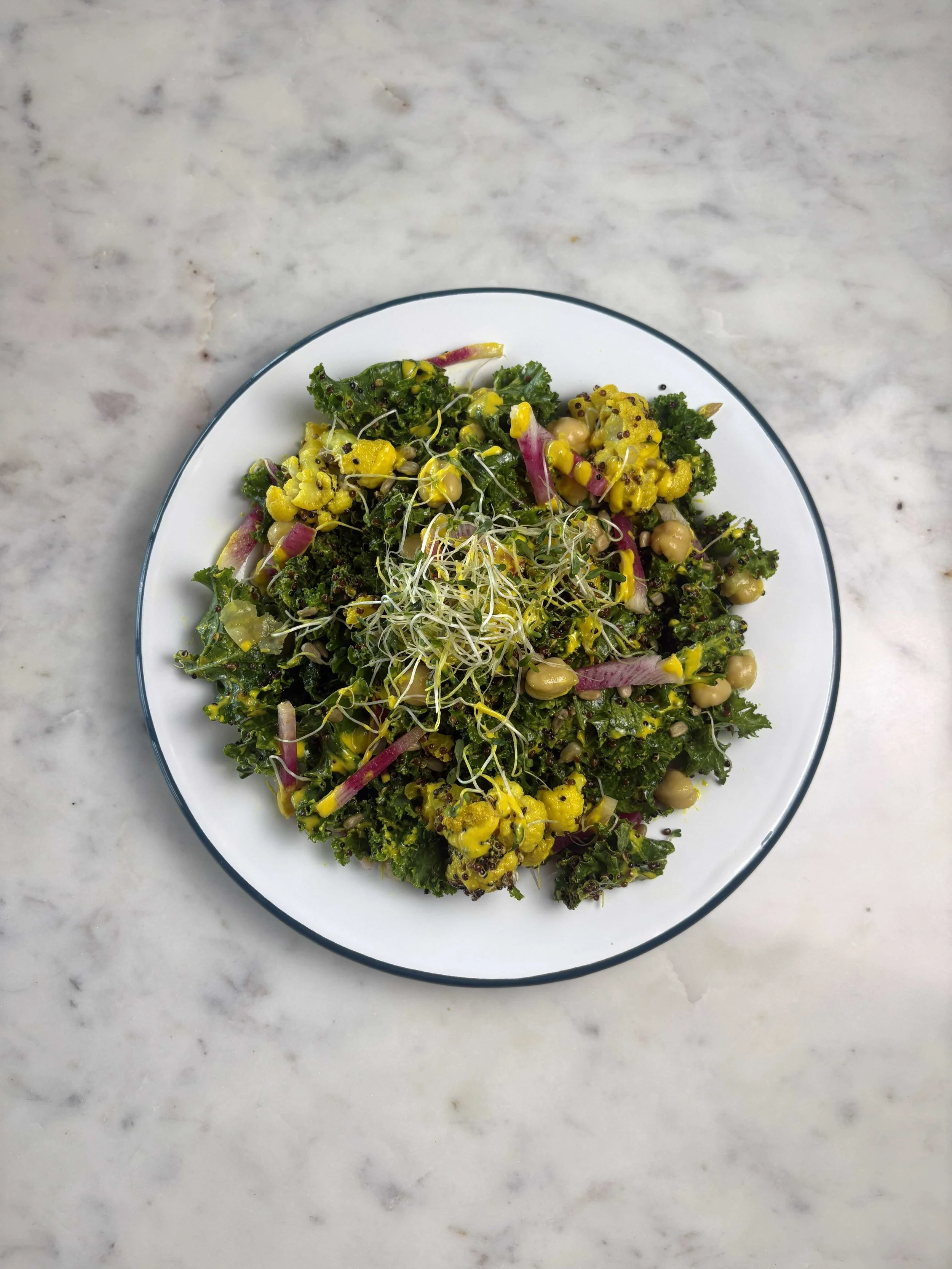 Turmeric roasted cauliflower, baby kale, quinoa, marinated chickpeas, sprouts, watermelon radish, sunflower seeds, golden lemon-tahini dressing