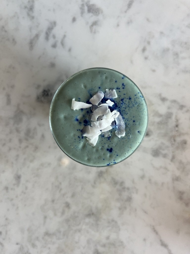 Banana, pineapple, avocado, coconut flakes, almond butter, blue spirulina, agave, coconut milk